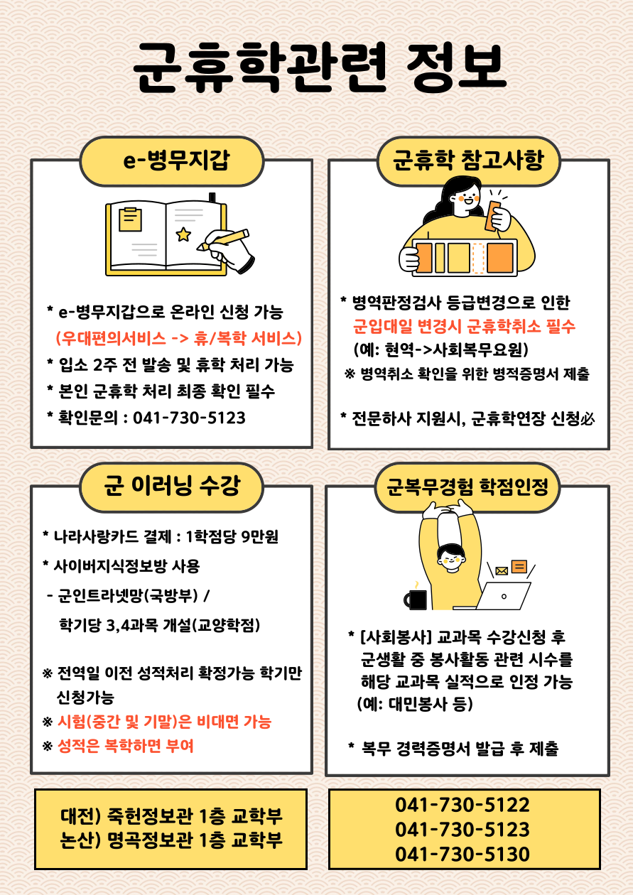 | 제목 | 입대예정자를 위한 군휴학관련 정보 안내 | ||||