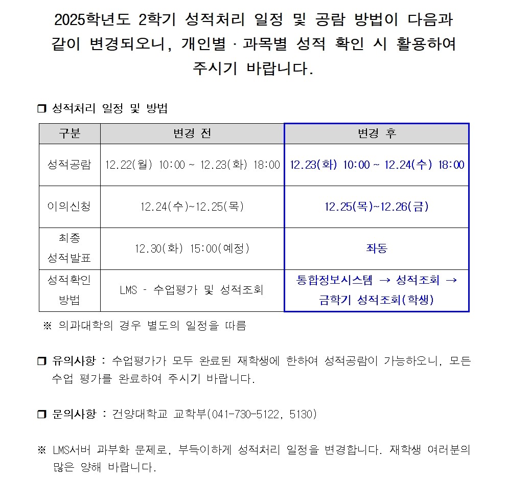 | 제목 | [긴급] 2025학년도 2학기 성적처리 일정 변경 안내 | ||||