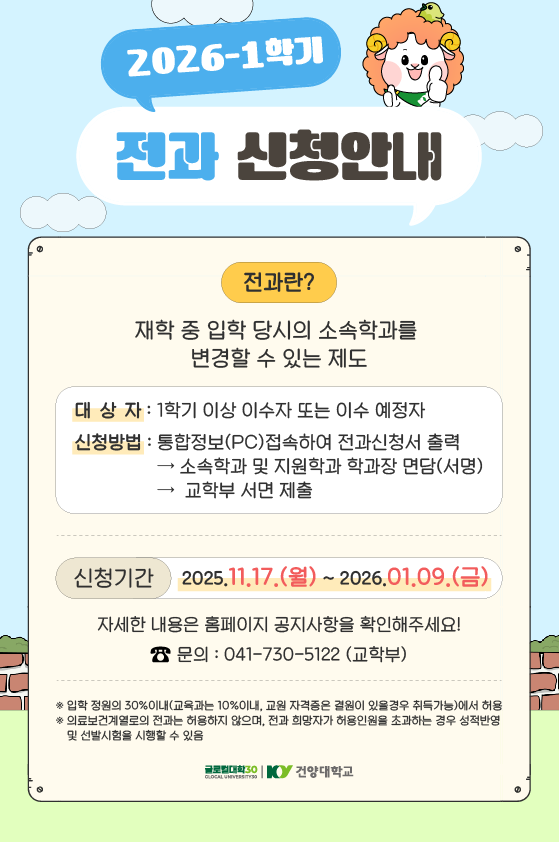 | 제목 | 2026학년도 1학기 전과 신청 안내 | ||||