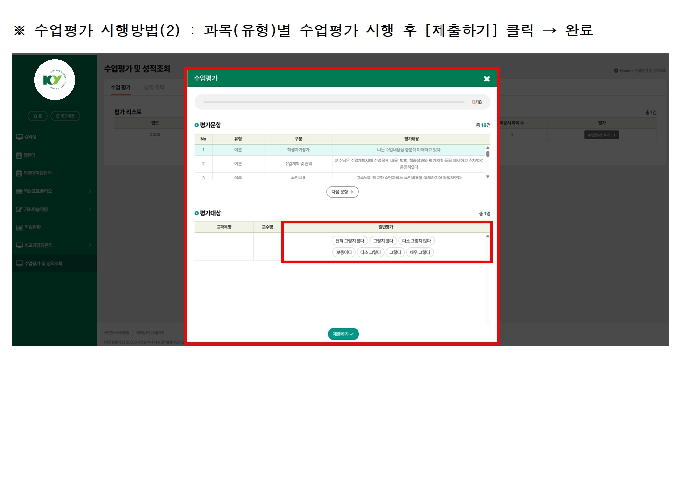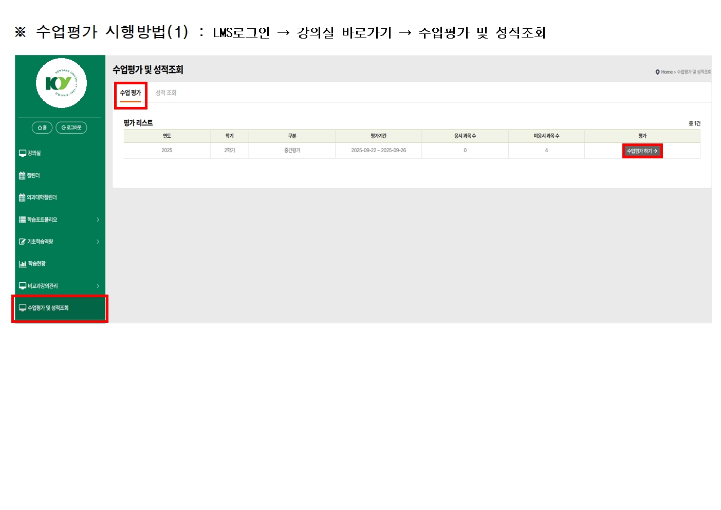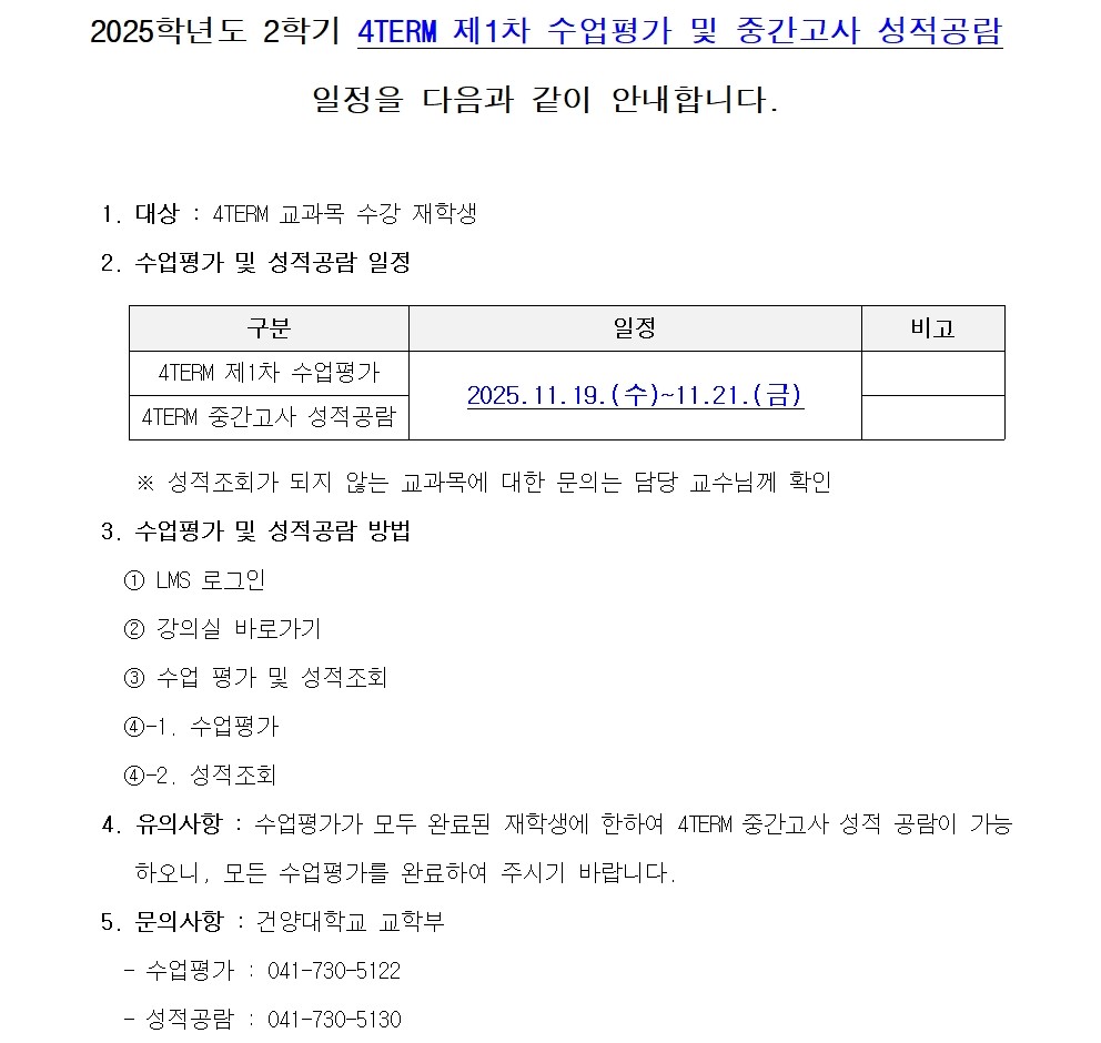| 제목 | 2025학년도 2학기 4TERM 제1차 수업평가 및 중간고사 성적 공람 안내 | ||||