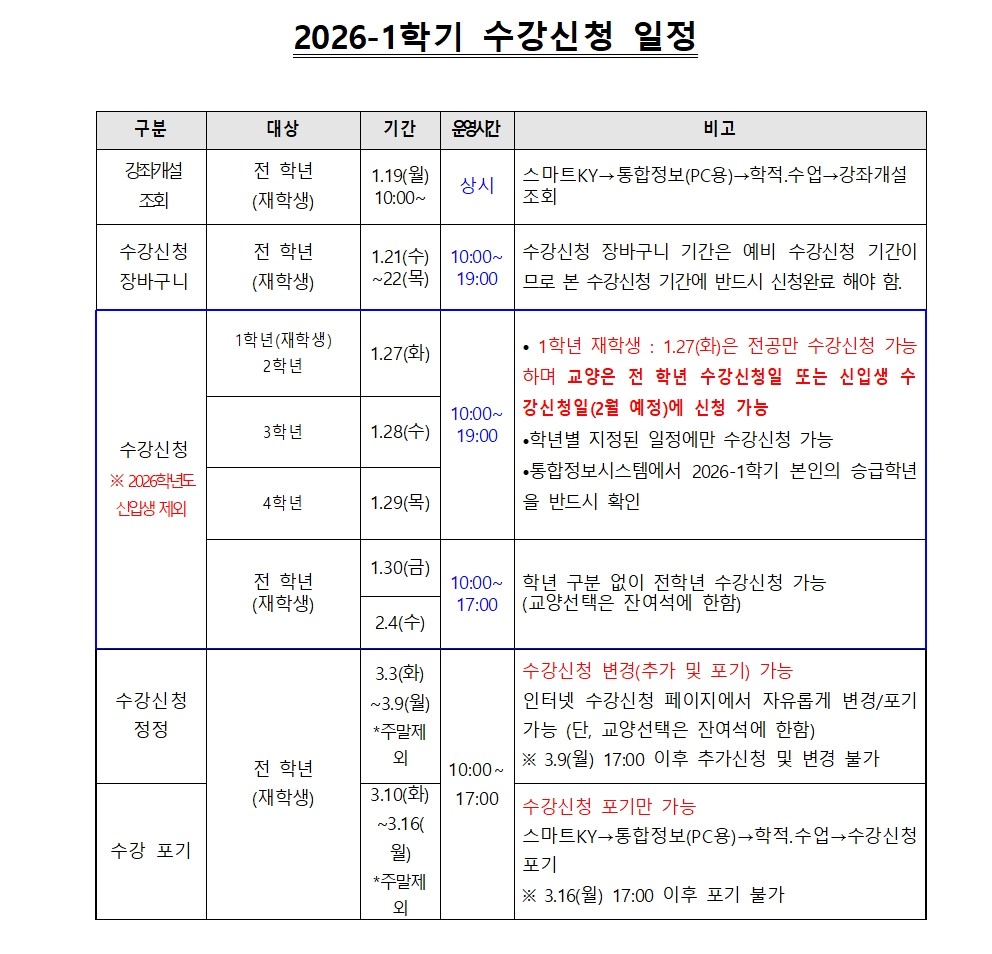 | 제목 | (수강신청) 2026-1학기 수강신청 안내(매뉴얼, 수강신청 FAQ) | ||||
