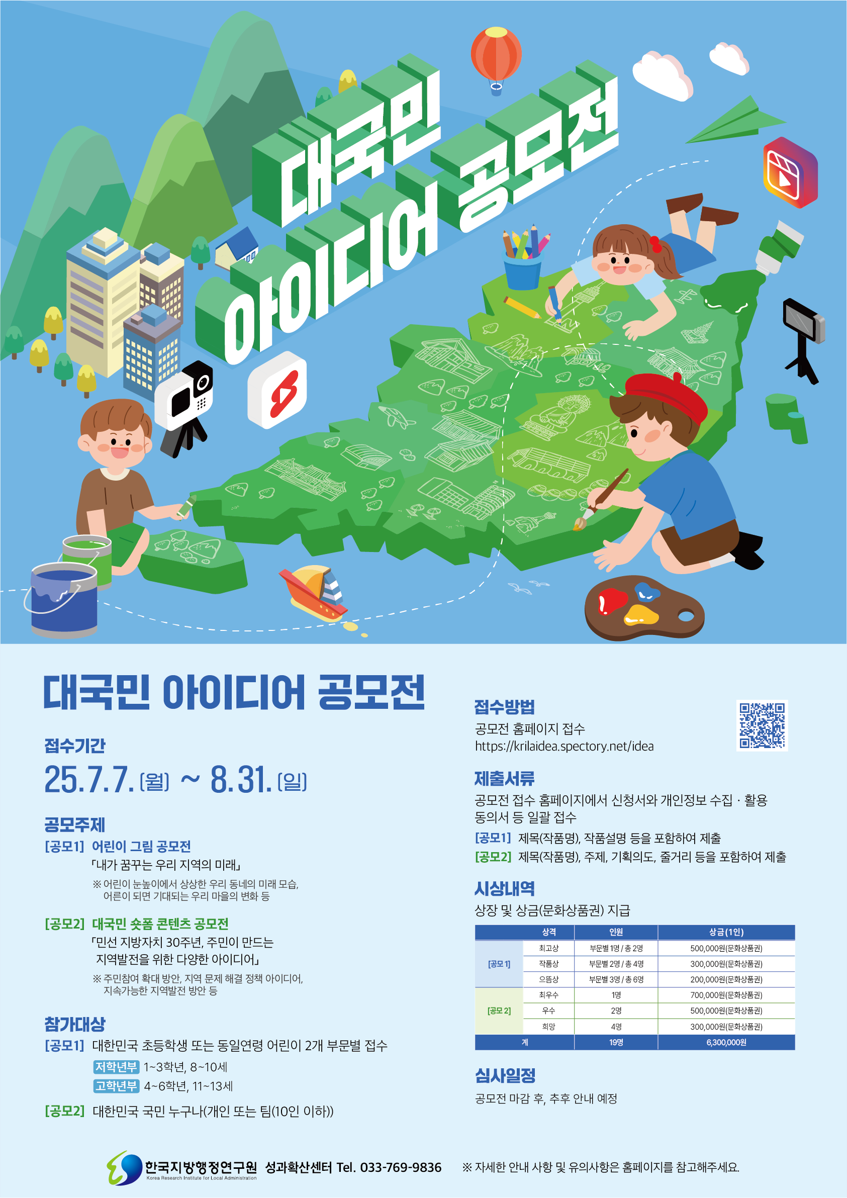 ❍ 공모명: 2025 대국민 아이디어 공모전 ❍ 공모주제: [공모 1] 어린이 그림 공모전:「내가 꿈꾸는 우리 지역의 미래」 [공모 2] 숏폼 콘텐츠 공모전:「민선 지방자치 30년, 주민이 만드는 지역발전 아이디어」 ❍ 접수기간: 2025. 7. 7.(월) ~ 8. 31.(일) ❍ 공모대상: [공모 1] 대한민국 초등학생 또는 동일 연령 어린이 (저학년부 / 고학년부) [공모 2] 대한민국 국민 누구나 (개인 또는 팀 참여 가능) ❍ 제출형식: [공모 1] 8절 도화지 그림 (촬영 또는 스캔하여 이미지 파일 제출) [공모 2] 15~59초 이내의 세로형 영상 콘텐츠 (1080×1920px, mp4 형식) ❍ 시상계획: 총 630만 원 상당의 문화상품권 및 상장 수여 예정 ❍ 응모방법: 공모전 홈페이지를 통한 온라인 접수 (https://krilaidea.spectory.net/idea)